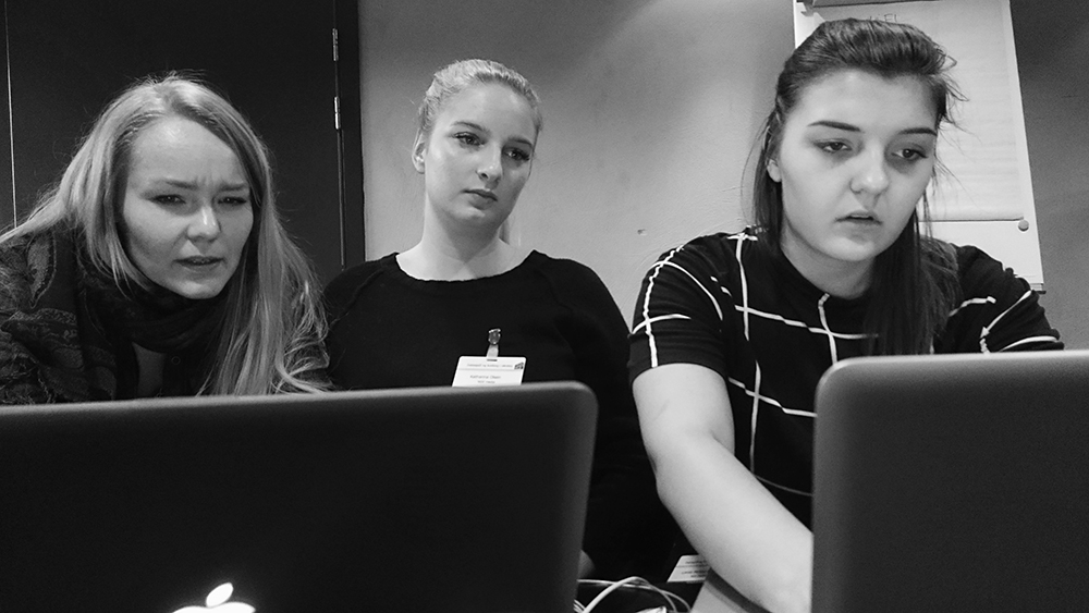 tre jenter og student jobber